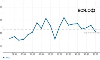 Евро: торги в начале месяца начинались с отметки 72,5806 руб. На 29 июня цена составила 73,0884 руб. Минимальный показатель наблюдался 5 июня (72,4384 руб.), максимальный – 20 июня (74,1847 руб.).