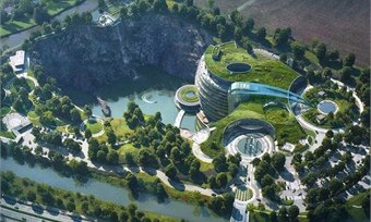 Вот один из них, воплощенный в жизнь. Невероятное футуристическое сооружение находится прямо в карьере. Высота его доходит до уровня земли. Таким образом, по сути, 18-этажное здание полностью под землей, причем 2 этажа находятся под водой. Это позволило украсить крышу великолепной растительностью. Виды водоема чаруют, как и огромный водопад. Этот отель построен для трех сотен туристов. Жильцы нижних этажей наслаждаются видами аквариума. Отель оборудован по последнему слову техники. В нем используются геотермальная и солнечная энергия.