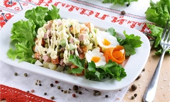 Необходимы: отварная картошка, отварная морковь, зеленый горошек, яйцо, буженина, зелень, майонез, зерновые булочки.