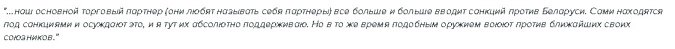 Президент отметил, что добро, которое Белоруссия делает РФ частенько оборачивается им злом. Батька обещал принять ответные меры, сказав, что надоело подставлять левую щеку, когда бьют в правую. «Как можно находясь под санкциями самим применять такие методы к партнерам?»", — недоумевает Лукашенко.