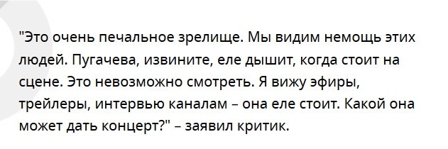 Также критик заметил, что артисты не имеют права выступать в немощной форме, упоминая Софию Ротару, Николая Носкова и саму Аллу Борисовну.
